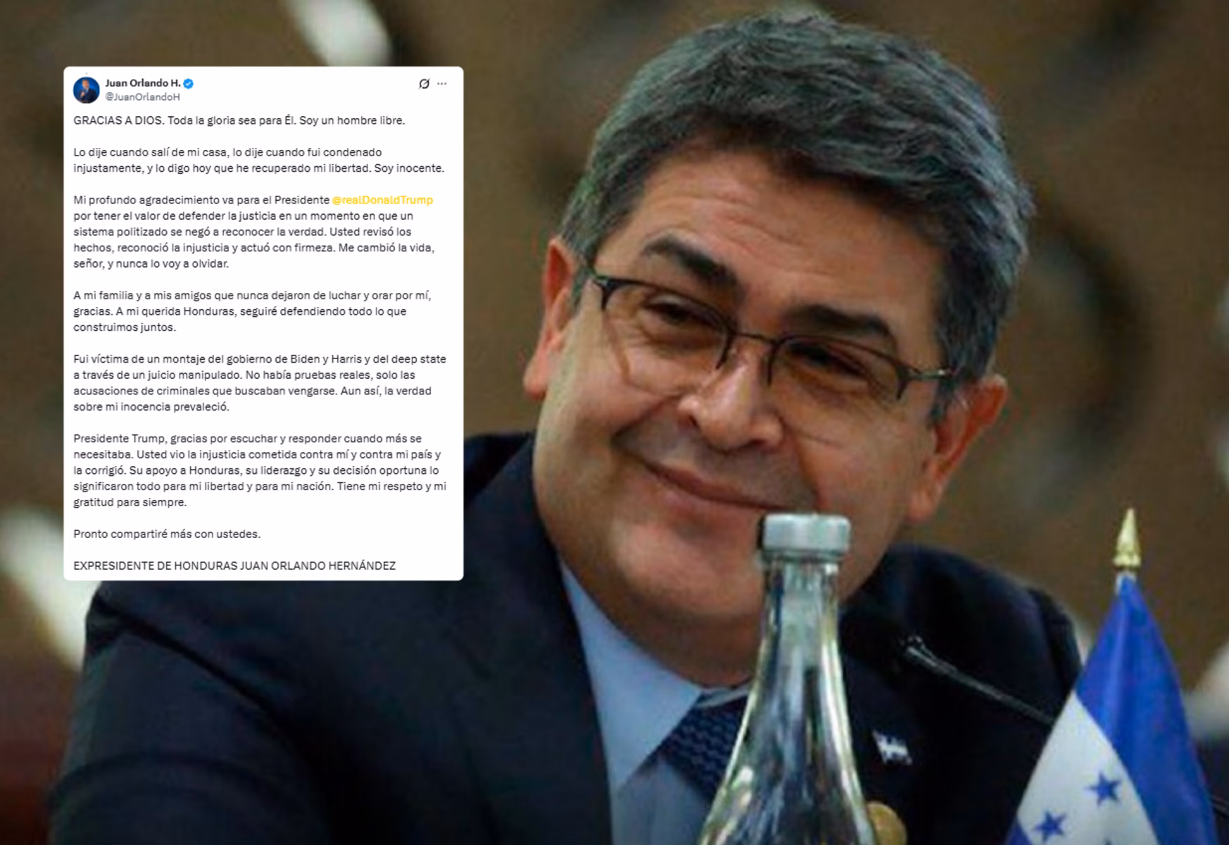 El expresidente Juan Orlando Hernández utilizó nuevamente sus redes sociales tras recuperar su libertad y después de ser indultado para agradecer al mandatario estadounidense Donald Trump, y afirmó ser víctima del exgobernante Joe Biden y de la vicepresidenta Kamala Harris.