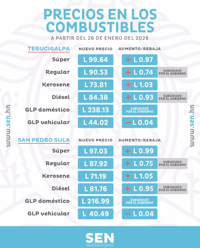 Finalmente, el único que va a tener una mínima baja es de 0.04 centavos, su nuevo precio es de 44.02 lempiras a partir del próximo lunes 26 de enero del 2026. AB/Hondudiario